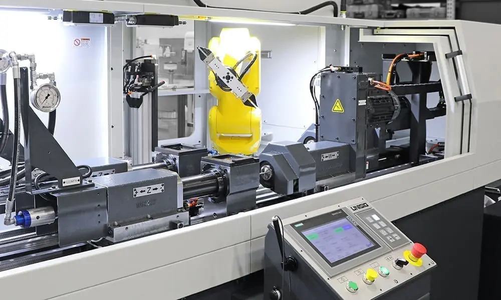The new operating system, featured on UNISIG’s UNE6-2i-750-CR small-diameter gundrilling machine, streamlines the setup of dozens of different part handling combinations to reduce new part setup times by 80% or more. The system significantly improves the communication between the machine’s human machine interface (HMI) and the robotic controller. This enables centralized data storage or a single source of truth -– the coding and data for the gundrilling operation and the program for the part handling are stored together for ease of recall.